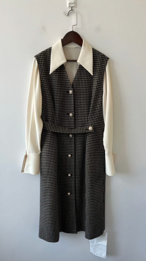 This isn’t your average off-the-rack dress. Every detail of this 100% polyester plaid piece is rooted in the designer’s vision: polished, functional, and full of subtle charm. Let’s break down the elements that make this designer wear a must-see—from the silhouette to the smallest accent.