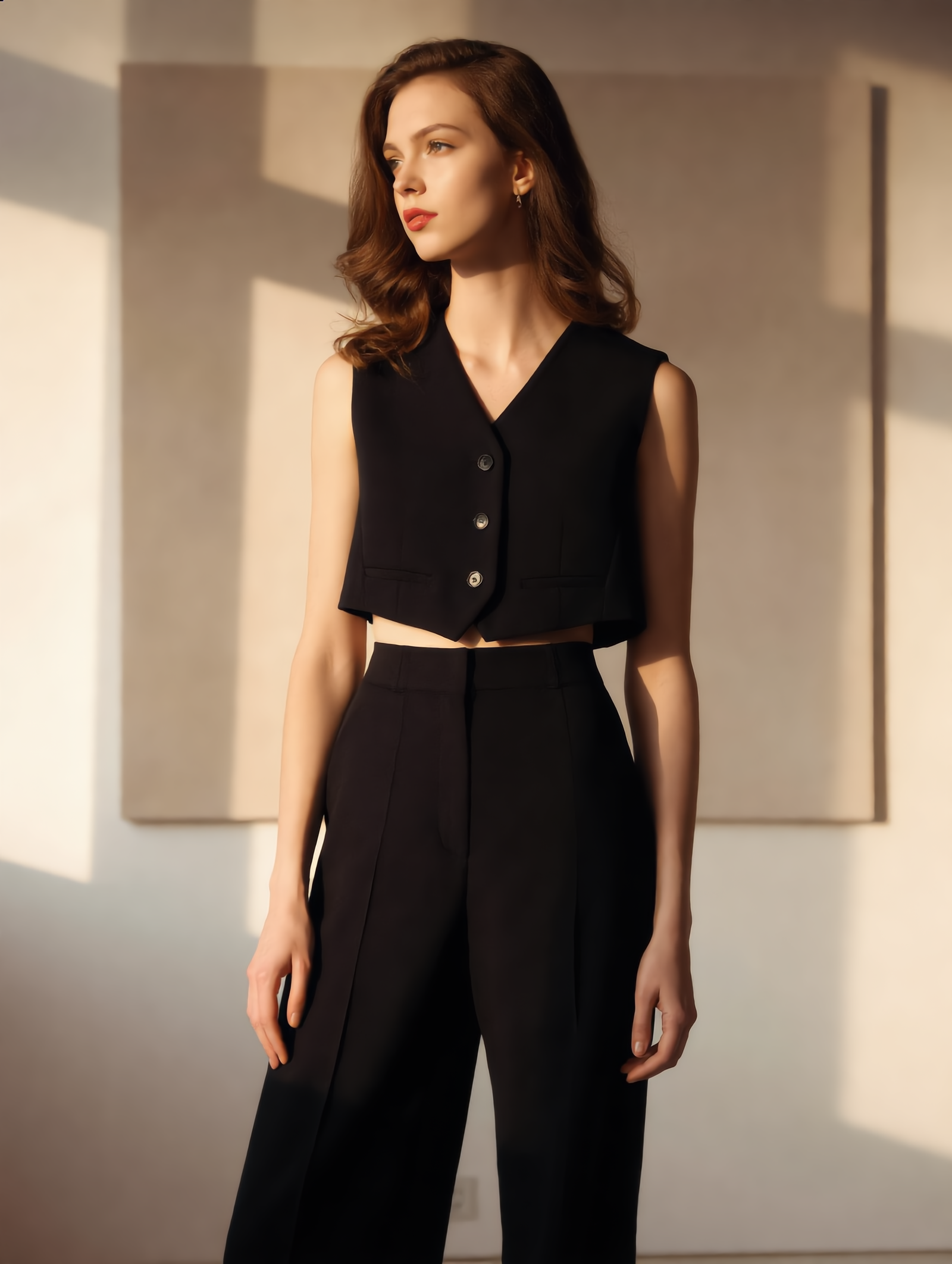 This Vest is crafted from 100% pure polyester, offering a polished, wrinkle-resistant finish ideal for layering. Featuring a V-neckline, button-front closure, and subtle decorative pockets, it delivers a structured, modern silhouette that flatters every body type. The versatile black hue pairs effortlessly with tailored trousers, skirts, or denim, transitioning seamlessly from office meetings to weekend outings. Fully customizable for OEM partners: choose custom colors, adjust design details (e.g., logos, buttons), and benefit from flexible MOQs. Durable, easy to care for, and timeless, this Short Vest is a essential addition to any wardrobe or brand collection.