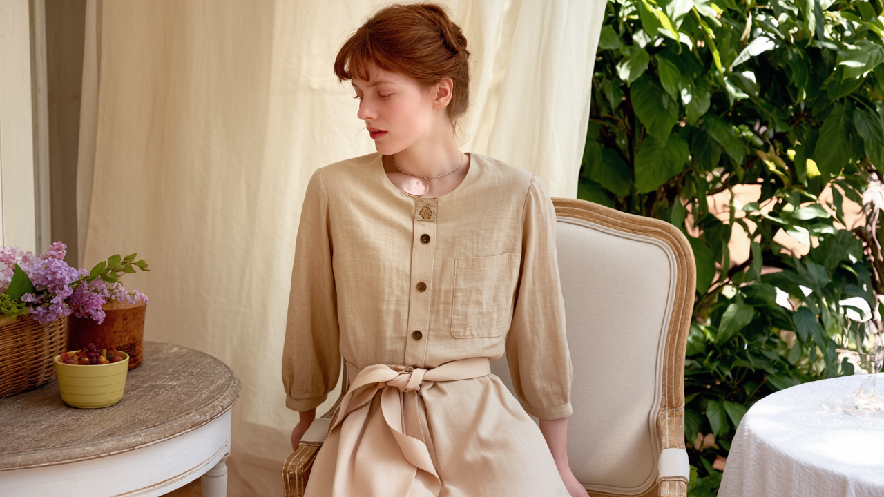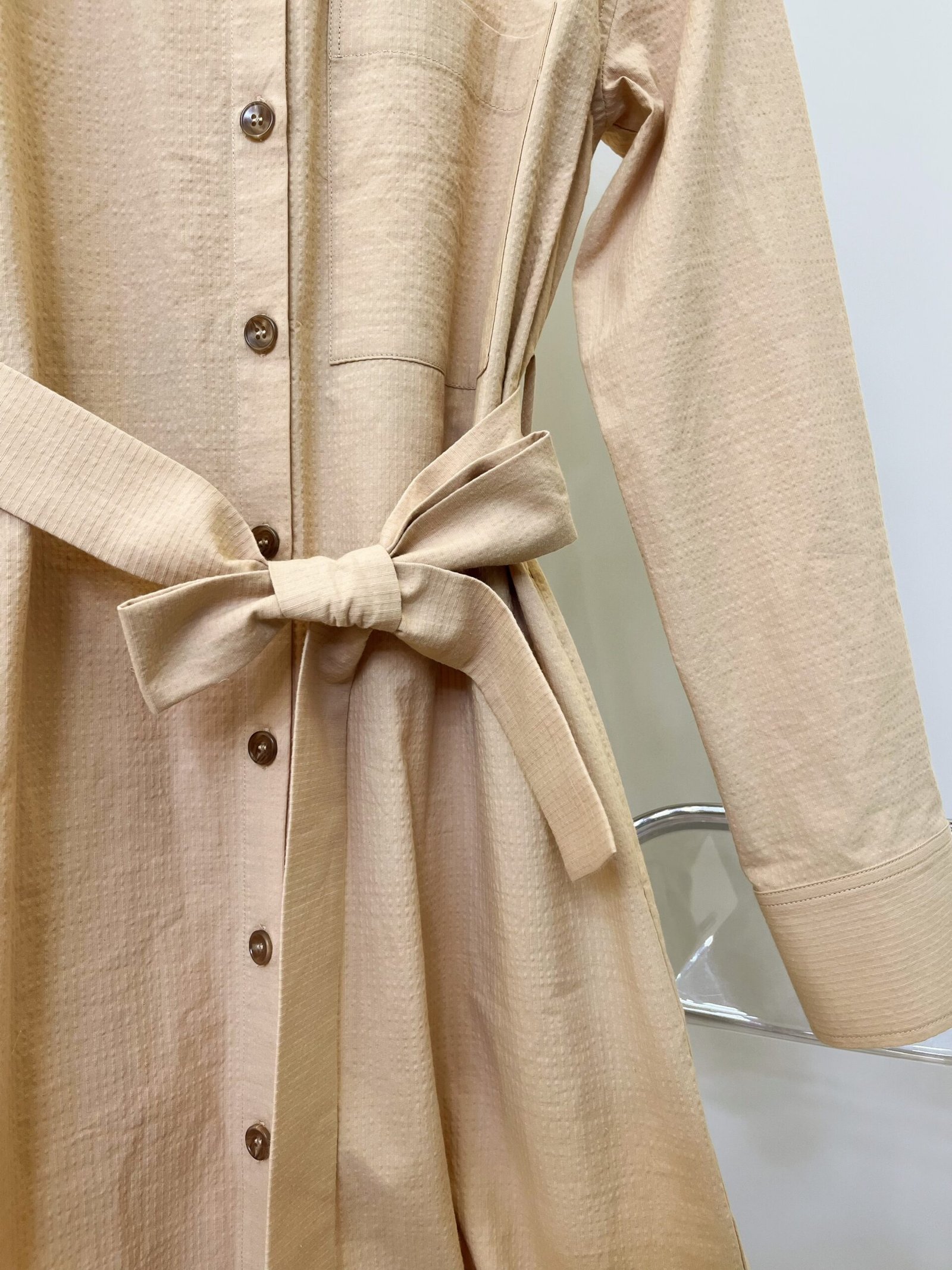 A detachable self-fabric belt cinches at the waist (tied in a delicate bow) to define your silhouette, while the relaxed midi length (with a subtle side slit) ensures unrestricted movement. The long, tailored sleeves (finished with clean cuffs) add a refined touch, and a discreet chest patch pocket offers a functional yet understated detail.