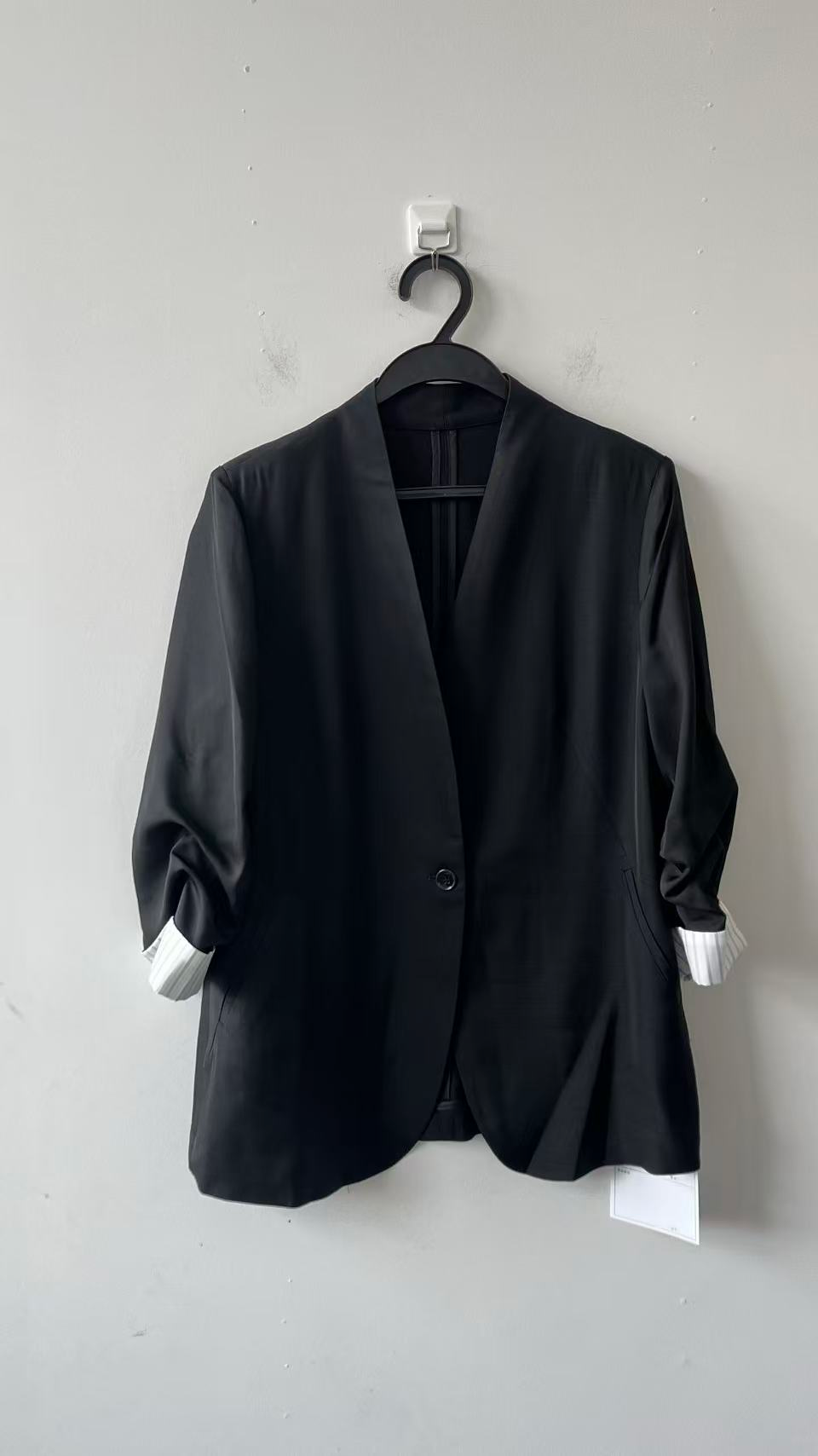 This linen casual blazer is expertly crafted from a premium linen blend, offering unbeatable breathability, softness, and timeless style. Featuring a sleek no-lapel V-neck, single-button closure, and ruched 3/4 sleeves with a striped inner lining, it balances relaxed comfort with polished sophistication. The loose, oversized fit skims the body beautifully, while functional side pockets add practicality. Available in classic black and soft blush, it transitions seamlessly from office days to weekend outings, making it the ultimate versatile staple for the modern wardrobe.