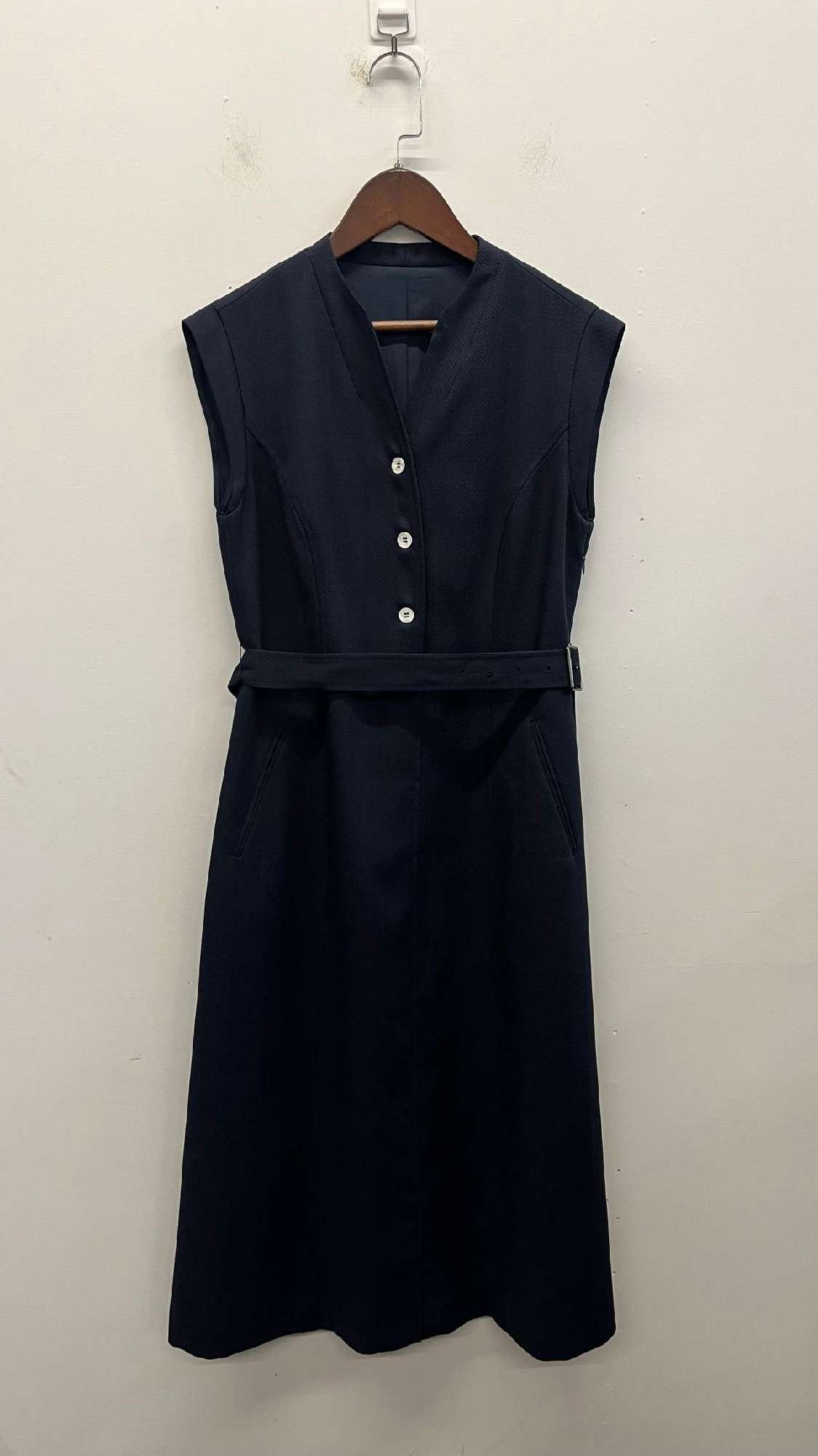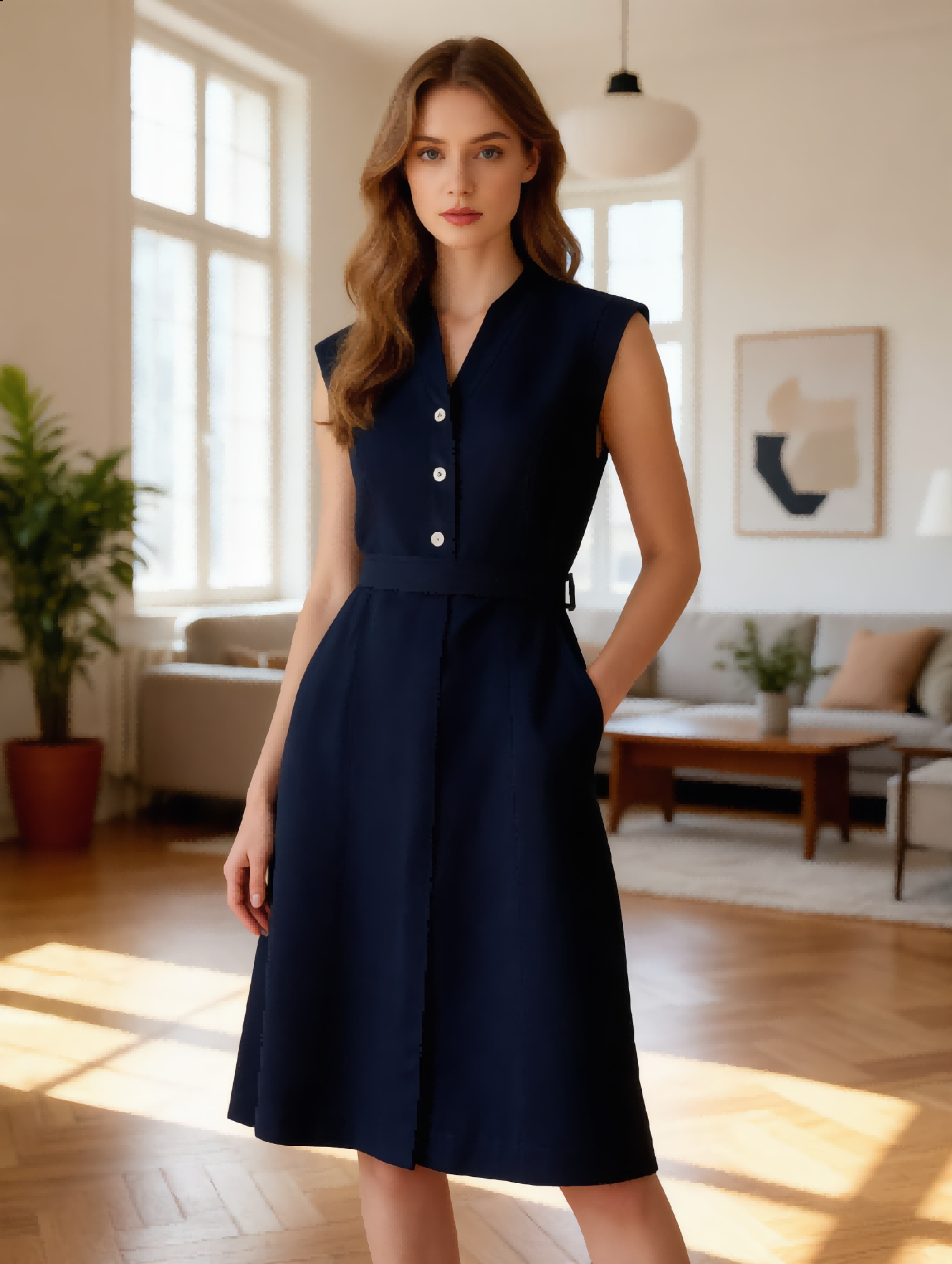 Our navy dress is a modern take on a timeless classic, designed for the woman who values comfort, quality, and effortless style. Made from a premium blend of 97% polyester and 3% elastane, this sleeveless dress offers exceptional durability, wrinkle resistance, and a comfortable stretch that moves with you. The refined V-neckline and three white button details add a touch of classic charm, while the matching self-belt cinches the waist to create a flattering silhouette. With side pockets for added functionality and a mid-length A-line skirt, this dress transitions seamlessly from the office to a night out, making it the ultimate addition to any modern wardrobe.