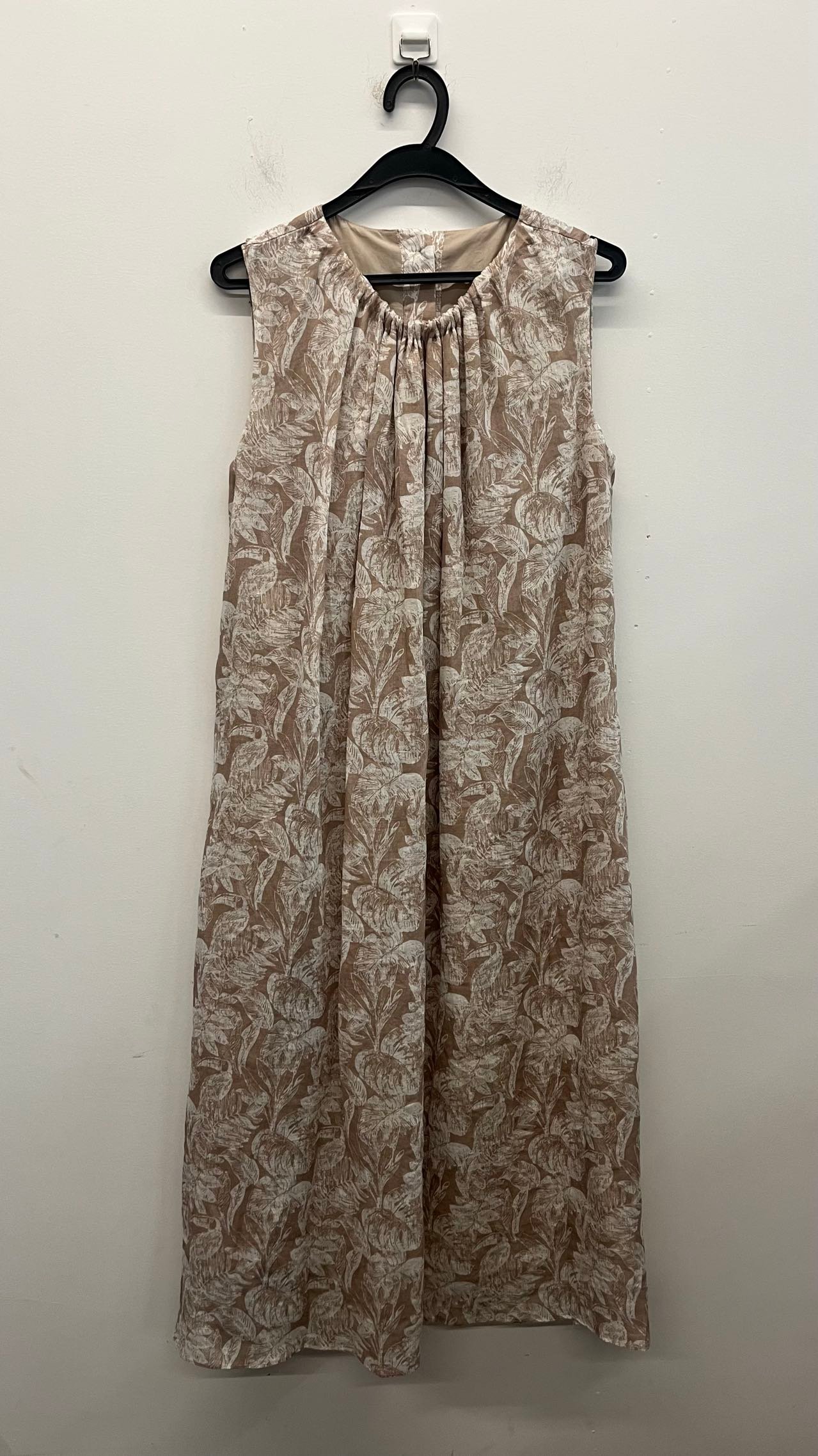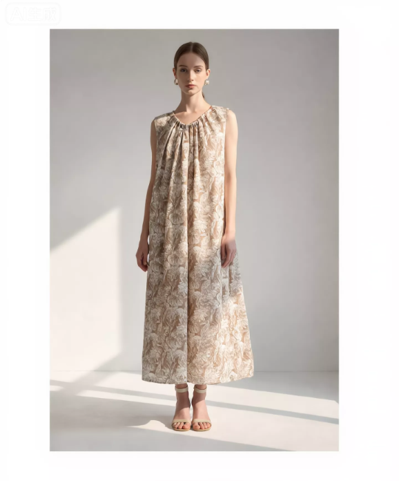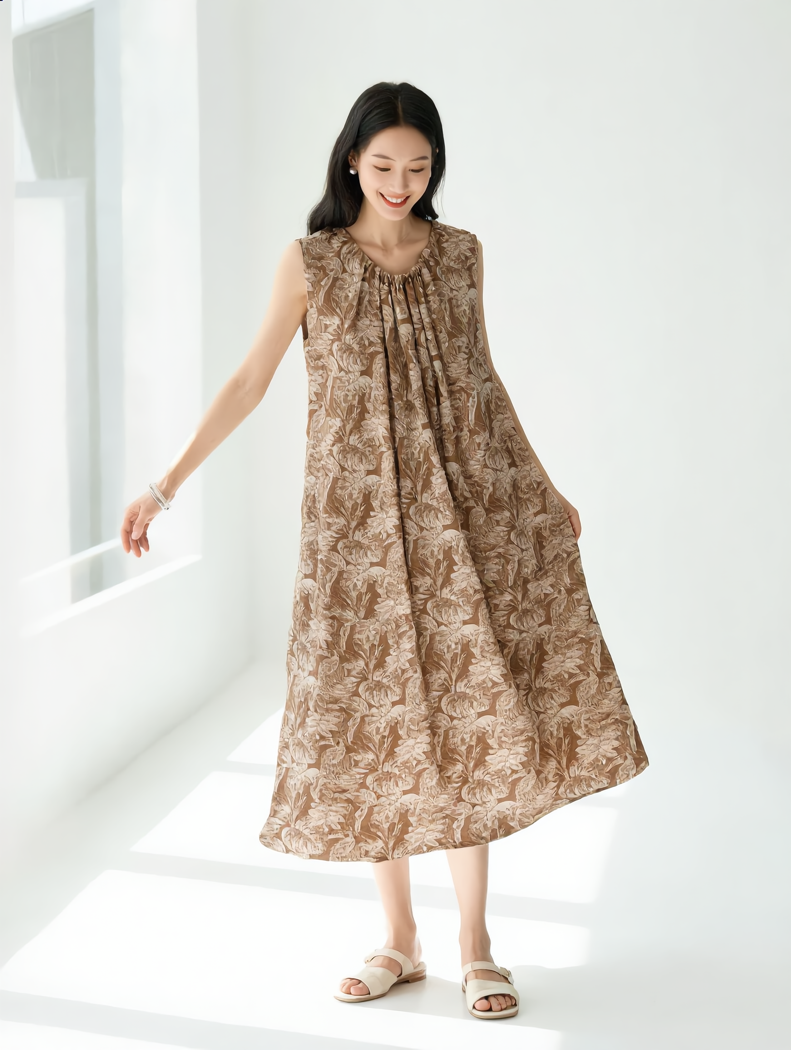 Crafted from 100% premium ramie fabric, this dress offers unparalleled breathability and durability, keeping you cool and comfortable all day long. The sleeveless, A-line silhouette features a soft gathered neckline, creating a feminine, flowy shape that flatters all body types. The delicate vintage floral pattern in warm beige and white tones adds a touch of understated elegance, making it perfect for casual outings, vacations, and even professional settings.