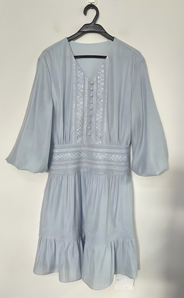 The delicate lace and sequin detailing, combined with the flowy tiered silhouette, elevates this piece from a simple dress to a statement of refined style. Whether you’re strolling along the coast or enjoying a brunch with friends, this dress ensures you look and feel effortlessly chic.