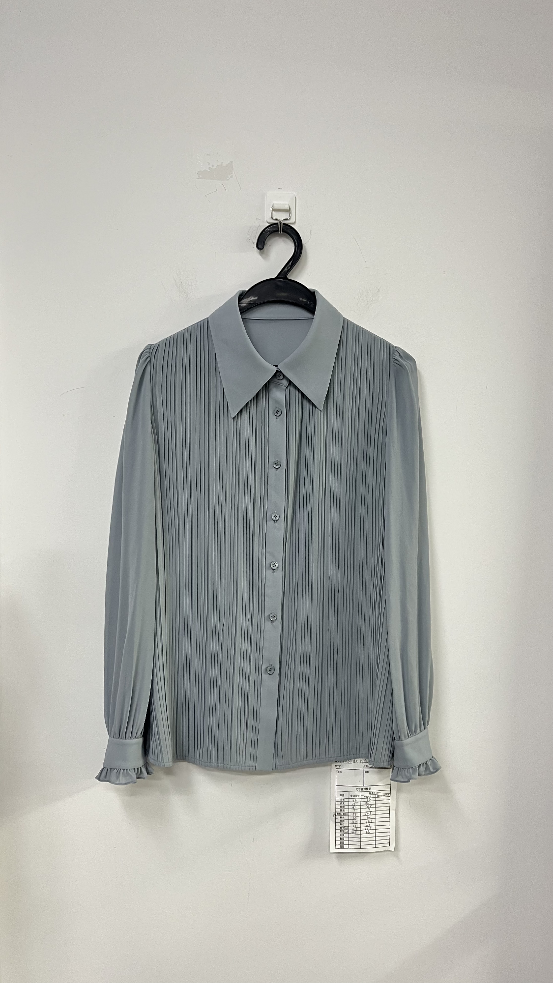 Crafted from 100% pure polyester, this gray-blue pleated blouse is designed to elevate every wardrobe. The vertical front pleats create a flattering, elongating silhouette, while the classic pointed collar adds a touch of professional polish. The billowy long sleeves feature delicate ruffled cuffs, infusing a feminine, romantic flair that balances the structured design. The button-down front allows for adjustable styling, making it easy to transition from a formal office look to a relaxed weekend ensemble. The lightweight, wrinkle-resistant polyester fabric ensures all-day comfort and a polished appearance, while the beautiful gray-blue hue complements every skin tone and pairs seamlessly with a wide range of bottoms, from tailored trousers to denim and skirts.