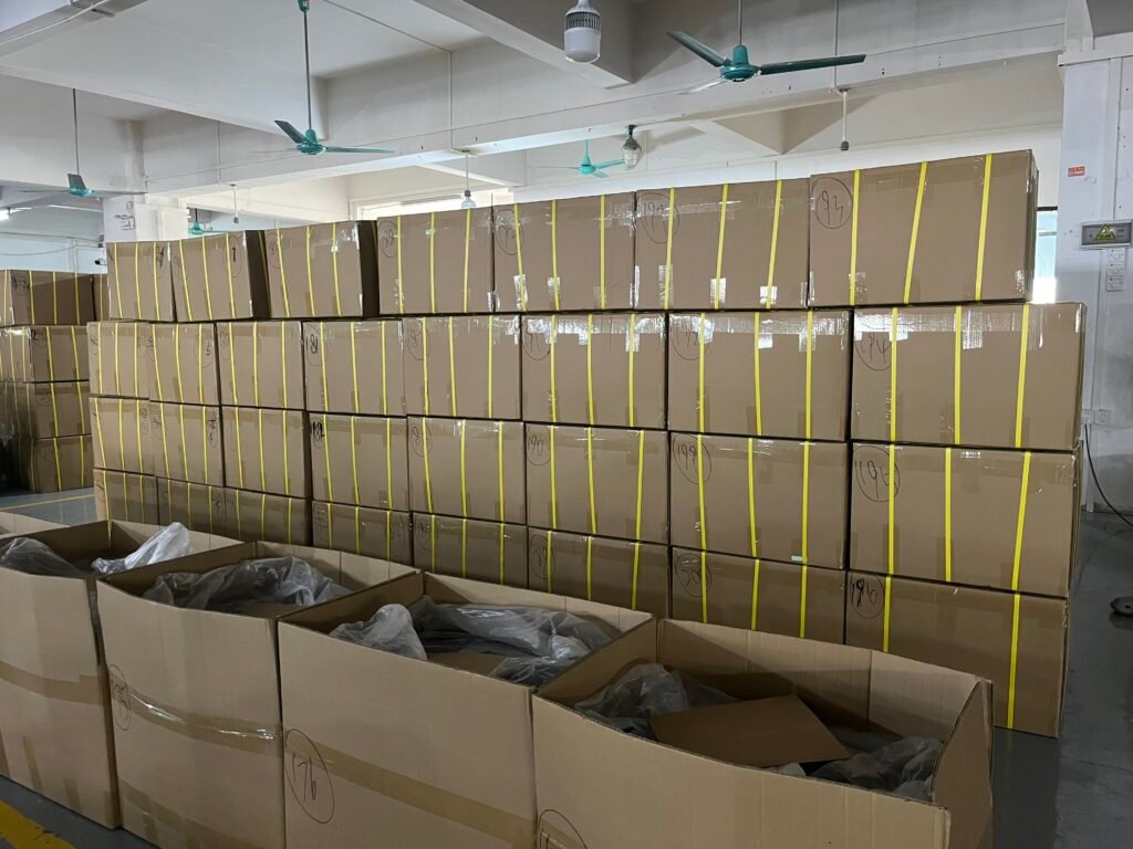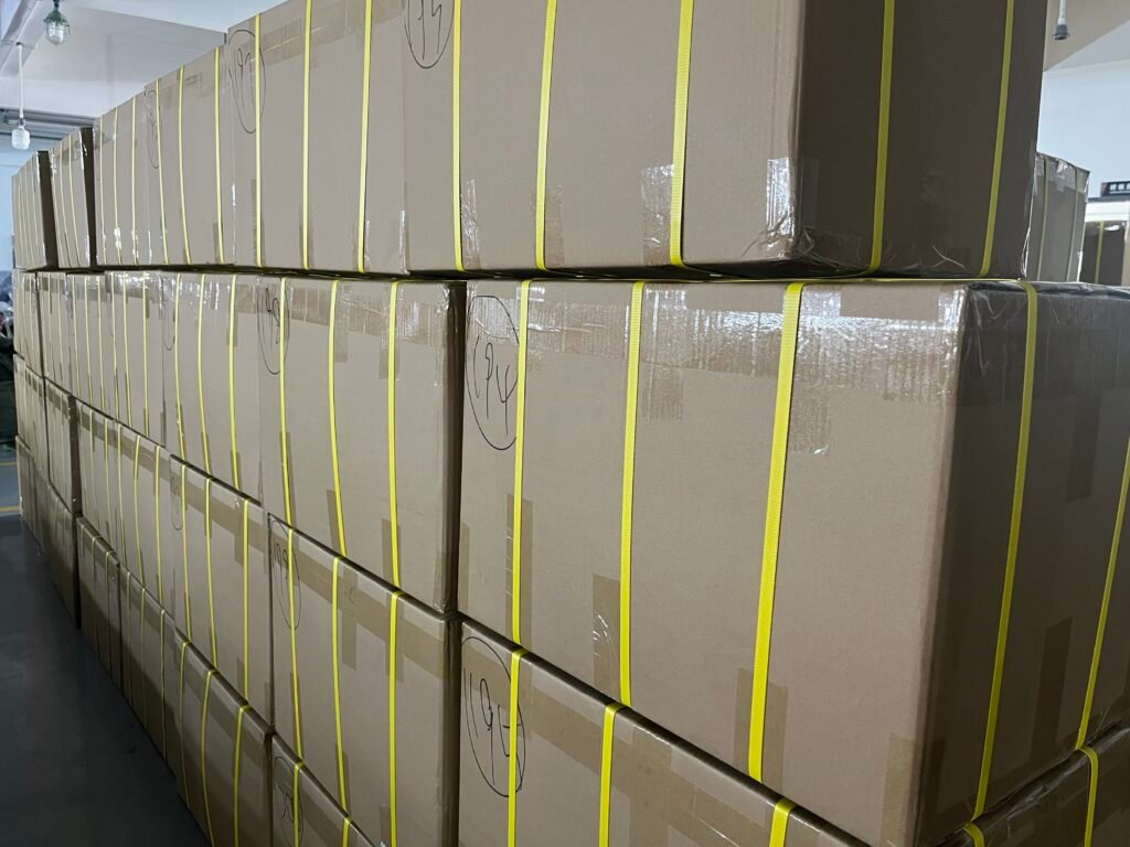 By late October, our factory begins to transform. What was once open floor space becomes a maze of stacked shipping boxes, each labeled with client names, destination ports, and order numbers. Pallets tower high, waiting for trucks to transport them to nearby ports like Shanghai or Ningbo, where they’ll be loaded onto containers bound for Europe, the US, and beyond.