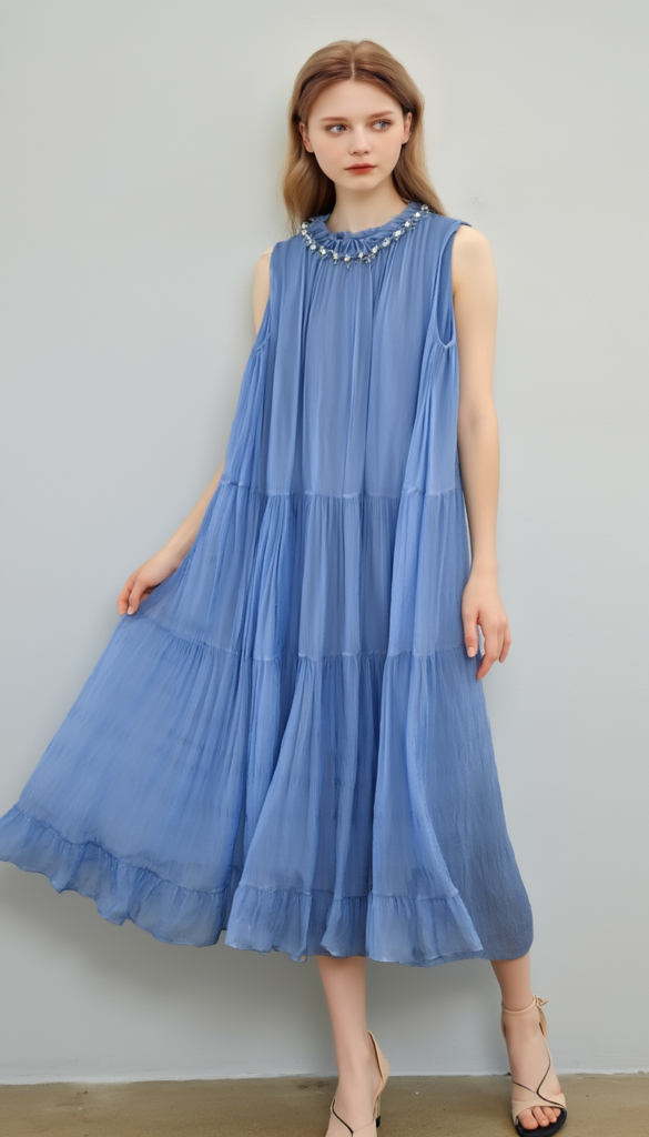 Summer is a season of contradictions. We crave lightness, yet demand durability; we seek elegance, but refuse to sacrifice comfort. For years, I cycled through a parade of summer dresses—some too sheer, some too heavy, some so restrictive that even a gentle breeze felt like a struggle. Then, I found this light blue sleeveless maxi dress, and everything changed. What makes it so special isn’t just its ruffled neckline or the way it flows like water; it’s the fabric at its core: Tencel™ Lyocell.