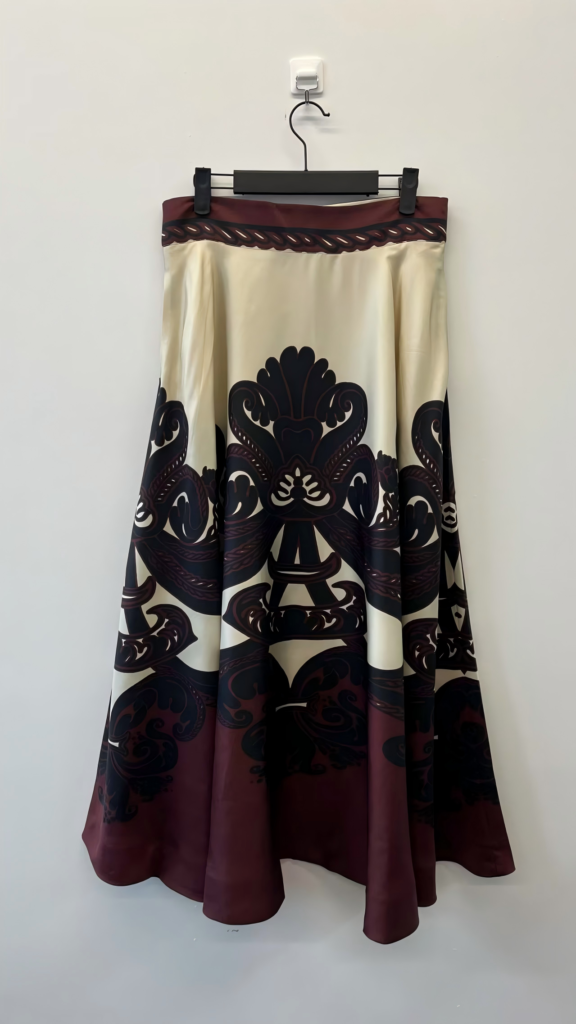 The print itself is a masterpiece of design, featuring intricate, symmetrical patterns in a rich palette of deep burgundy, cream, and black. Drawing inspiration from baroque and rococo aesthetics, the motifs are both ornate and contemporary, creating a striking visual contrast that is both timeless and on-trend. The use of negative space and bold color blocking gives the print a sense of movement and depth, making it a statement piece that is sure to turn heads.