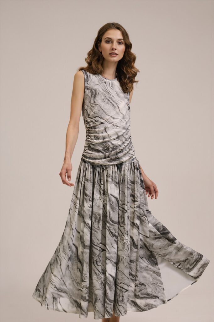 One of the most distinctive design elements of the dress is the ruched waist detail. This feature is not just a decorative touch; it is a carefully crafted element that serves to flatter the figure. The ruching creates a cinched-in effect at the waist, accentuating the wearer’s natural curves and creating a more defined silhouette. This detail also adds texture and visual interest to the dress, breaking up the continuous ink wash print and adding a sense of depth to the design. The ruching is done in a subtle, elegant way, avoiding the over-the-top frills that can sometimes make ruched clothing look dated or overly fussy.